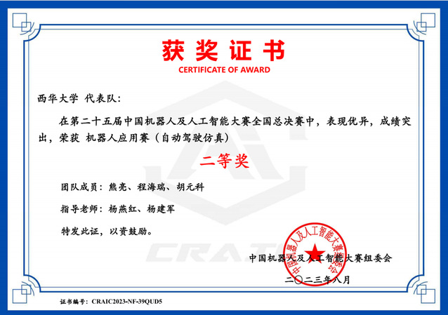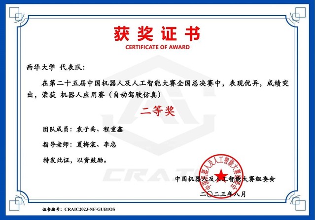 2023年8月21日,由人工智能学会、绵阳市人民政府共同主办的第二十五届机器人及人工智能大赛全国总决赛落下帷幕,由我校betway必威西汉姆联杨燕红老师、杨建军老师指导,betway必威西汉姆联熊亮、程海瑞和胡元科三名同学组成的西华大学“岁月如歌”、我校计算机与软件工程学院的夏梅宸老师与betway必威西汉姆联杨燕红老师指导的计算机与软件工程学姜力恒、季雨荷和betway必威西汉姆联王柳树三名同学组成的西华大学“写的代码都对”、我校计算机与软件工程学院的夏梅宸老师和李忠老师指导的袁子禹和程重鑫两位同学组成的“不知道怎么改才对”在本次比赛中均获得自动驾驶虚拟仿真赛项的全国二等奖,为学校争得荣誉。