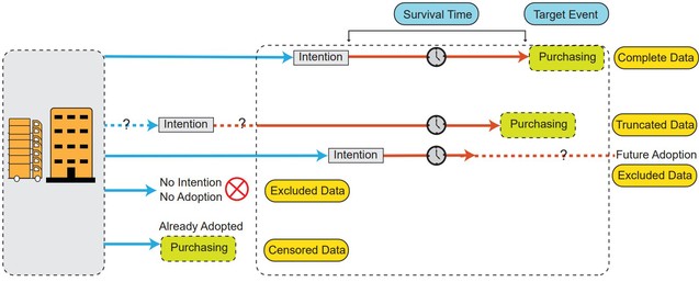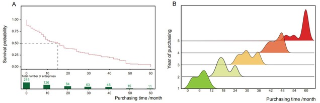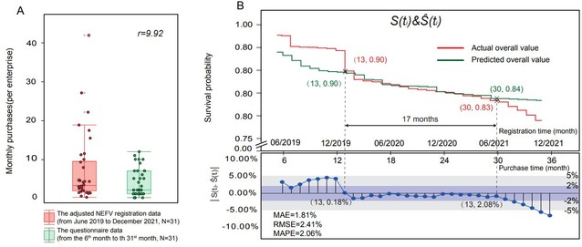 Figure 6. (A) The distribution of questionnaire data and adjusted NEFV registration data. (B) The monthly survival probability of adjust actual purchase data and predicted data with their predictive accuracy indicators.