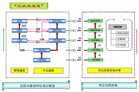 员工分为专业类、市场类、技术类、管理类,根据规范的任职体系,员工可在本类别进行成长(一级至五级),也可以通过内部招聘,合理变岗,表现优秀的可晋升为管理类干部。