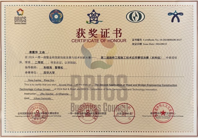 betway必威西汉姆联交通工程专业学生唐露萍、王森(指导教师:朱晓海、黎青松)荣获全国二等奖,西华大学荣获“优秀组织奖”。