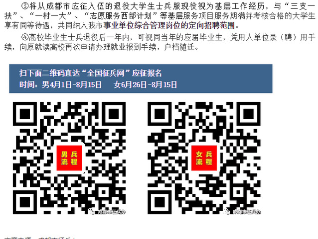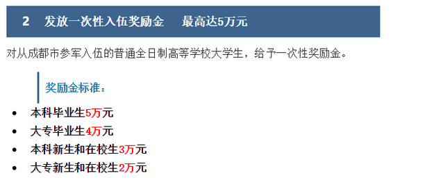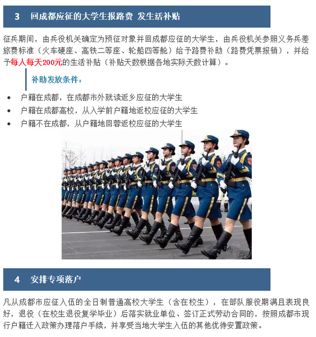 近日,成都市修订了《关于进一步鼓励大学生参军入伍的意见》,全面升级大学生参军入伍鼓励政策: