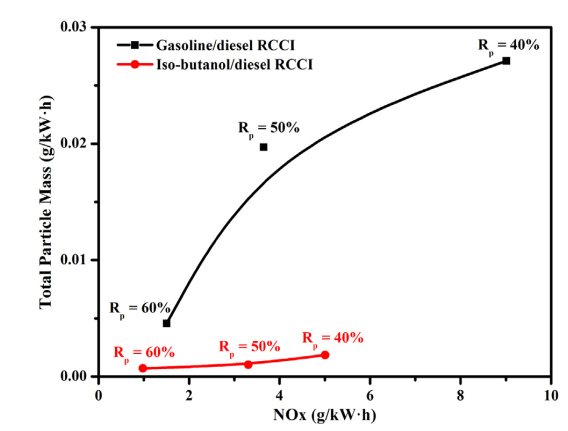 在排放控制方面,RCCI燃烧方式打破了主要污染物NOx和PM之间传统的trade-off关系,即通过调节燃烧控制条件可同时减少两种污染物排放。并且,相比于汽油/柴油RCCI燃烧方式,在相同燃烧控制条件下异丁醇/柴油RCCI燃烧方式的NOx和PM排放均显著降低,表明异丁醇作为低活性燃料在RCCI发动机排放控制方面更具潜力。