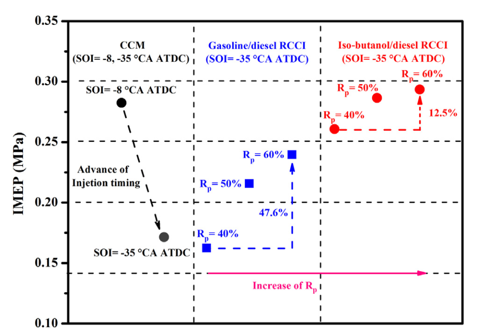 研究结果表明:异丁醇作为低活性燃料能够很好的提升RCCI发动机的动力性和经济性。在相同缸内循环总能量的条件下,异丁醇/柴油RCCI燃烧方式的平均指示压力(Indicated Mean Effective Pressure, IMEP)明显高于传统柴油燃烧方式和汽油/柴油RCCI燃烧方式。在异丁醇预混比为50%和60%条件下,异丁醇/柴油RCCI燃烧方式的IMEP相比于传统柴油燃烧方式的IMEP最大值分别增加了约1.4%和3.9%。