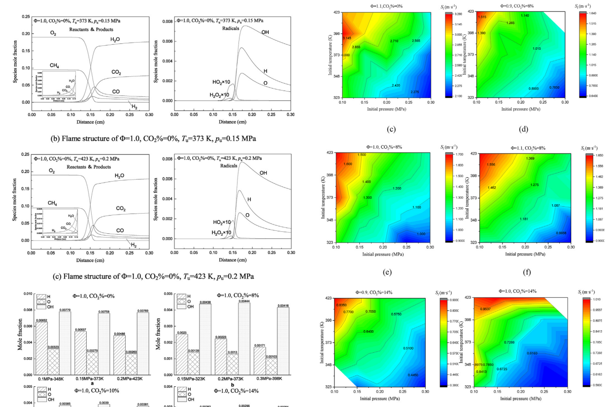 研究结果表明,同步提高初始温度和压力可以获得相似的火焰传播速率。相近火焰传播速率导致相似的火焰结构,而层流燃烧速率的微小差异是由自由基浓度的微小差异引起的。在较高的初始温度和压力下,无拉伸的火焰传播速率对这两种初始条件更敏感,而稀释率则会抑制这种敏感性。相似火焰传播速率下,火焰不稳定性在高温高压条件更强,主要受流体动力学不稳定性的影响,流体动力学不稳定性又主要受火焰厚度的影响。