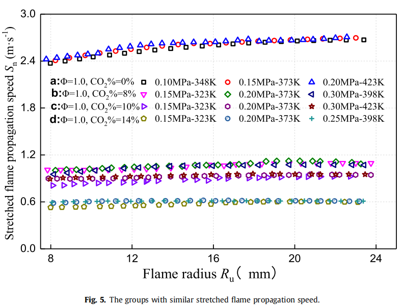 韩志强副教授课题组是国际上率先提出等量层流燃烧评价体系,并开展多参数耦合的量化规律研究的课题组之一。在揭示初始温度和压力耦合对甲烷-空气预混燃烧火焰传播速率的等量影响规律之后,进一步研究了具有相似火焰传播速度的层流燃烧速度,并对火焰不稳定性进行了分析。