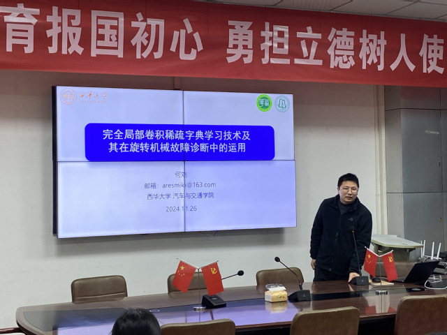 何刘的研究方向为车辆结构安全数据的智能分析与挖掘、智能图像识别与激光辅助视觉重建、物理可解释故障诊断深度网络技术、稀疏字典学习与压缩感知技术等。本次报告题目为“完全局部卷积稀疏字典学习技术及其在旋转机械故障诊断中的运用”。在报告中,何刘详细介绍完全局部卷积稀疏字典学习技术的核心思想及其创新性方法,讨论了该技术在旋转机械故障诊断中的具体应用。他结合实际案例,展示这一技术在旋转机械故障诊断中的优越性,并探讨了其在工业智能化发展中的广泛应用前景。