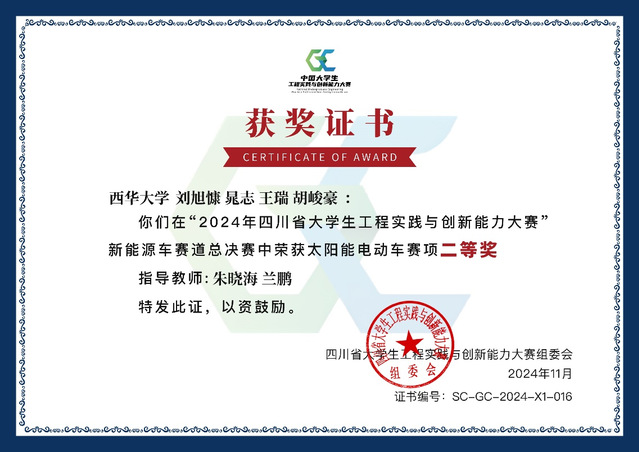 近日,2024年四川省大学生工程实践与创新能力大赛在四川大学举行唐岚、柳在鑫老师指导的交通工程专业学生赵凯狄、车辆工程专业学生罗洪、秦湘、曾飞扬和朱晓海、兰鹏老师指导的交通工程专业学生晁志、车辆工程专业学生刘旭慷、王瑞、胡峻豪,凭借出色的临场发挥和扎实的专业能力,分别荣获虚拟仿真赛道总决赛智能网联车设计赛项一等奖和新能源汽车赛道总决赛太阳能电动车赛项二等奖
