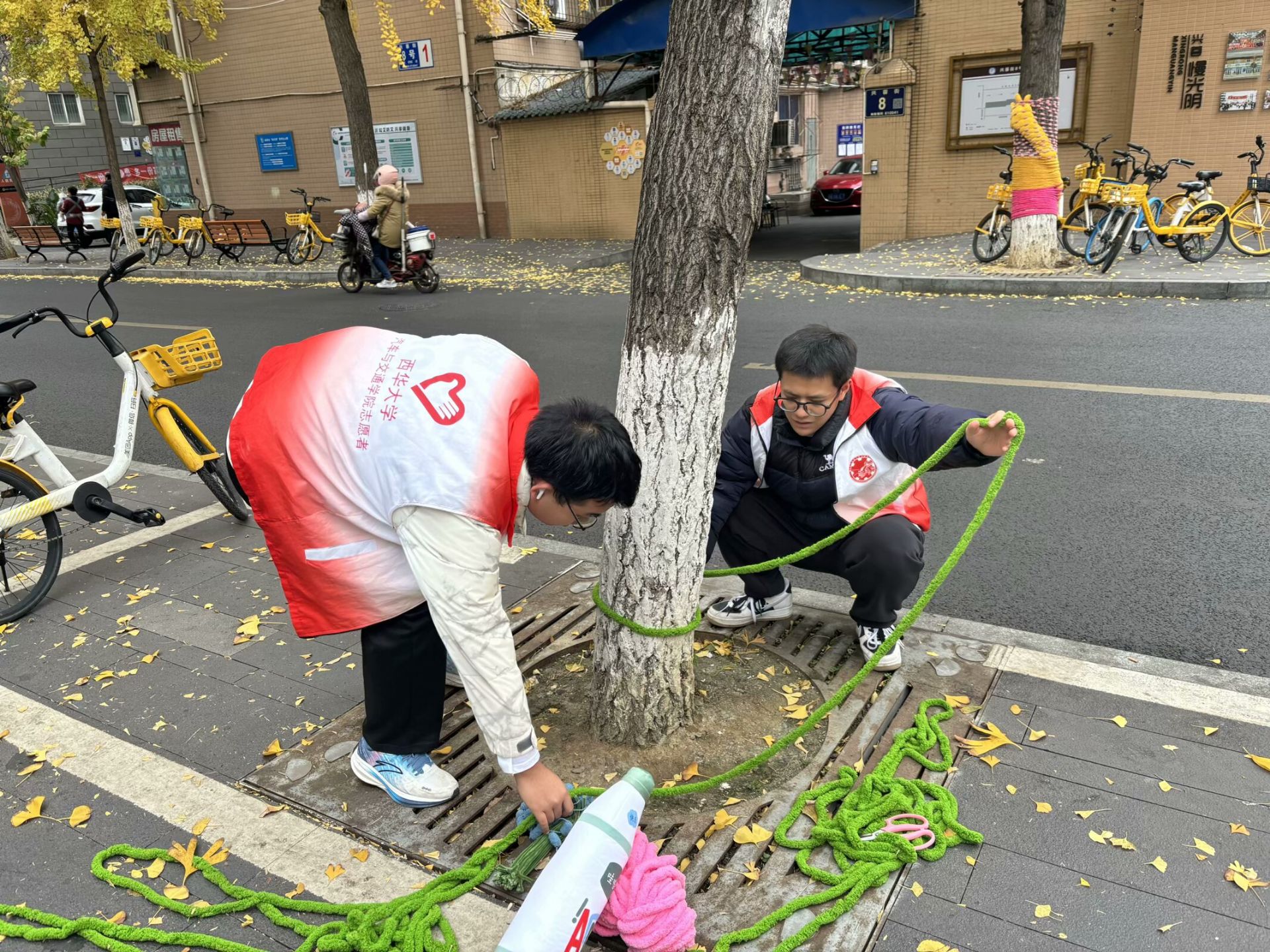 随后,在专业人员的指导下,利用编织材料为银杏树制作或修补树衣,为它们增添更多的保护与美感,充分展现个性化与多元化。此次活动顺利开展,不仅为树木送上了冬日的关怀,也进一步增强了志愿者们的环保意识和团队协作精神。