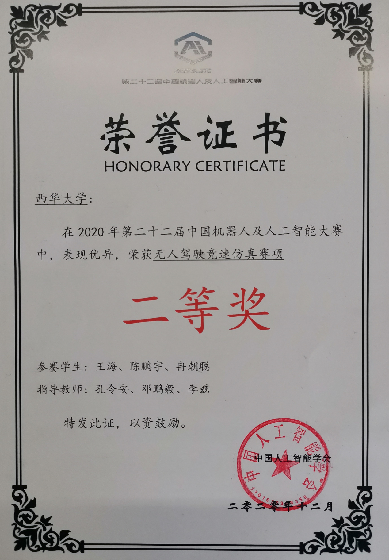 2020年12月,由中国人工智能学会承办的第二十二届中国机器人及人工智能大赛拉开帷幕。我校学生组成的西华大学智行车队参加了人工智能类比赛项目中的“无人驾驶竞速仿真赛”。该项比赛共有202支来自不同高校的参赛队伍,其中不乏有来自清华大学、北京大学、北京理工大学等一流名校的多支参赛队伍。经过我校学生的努力拼搏,荣获了该项目的二等奖。