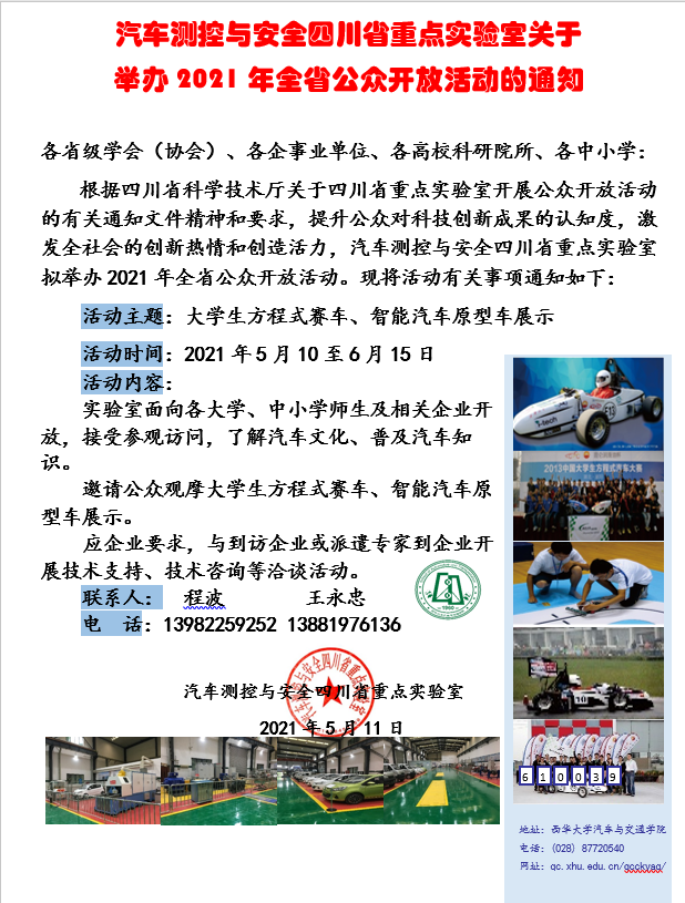 汽车测控与安全四川省重点实验室关于举办2021年全省公众开放活动的通知