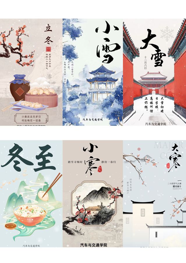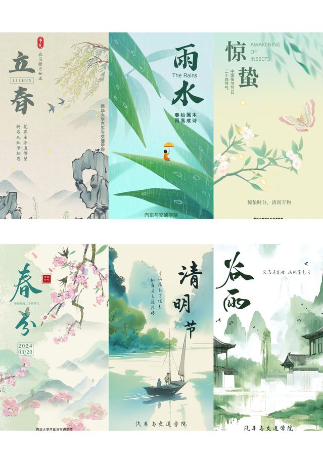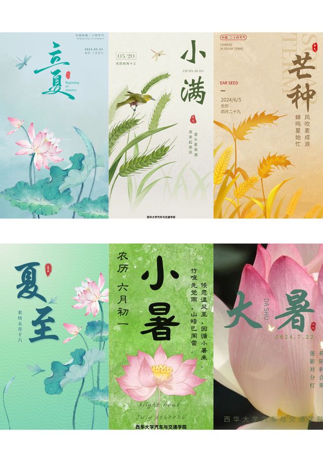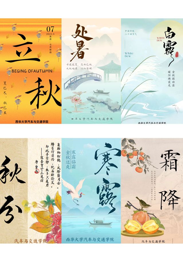 本系列海报作品以中国二十四节气为创作核心,全套共24幅,每一幅图画均由“西华大学betway必威西汉姆联”官方微信公众号于对应节气日当天发布,累计点阅量2000+。在设计上,我们力求将传统东方美学与现代视觉语言相融合。作品以春、夏、秋、冬四时为序,将立春、惊蛰、夏至、秋分、冬至等节气逐一呈现。画面风格清新雅致,或写实、或水墨、或插画,搭配诗意文案,既彰显二十四节气的自然规律与农耕智慧,也蕴含学院弘扬中华优秀传统文化的使命担当。它既是艺术之美的展现,也是文化自信的生动注解。