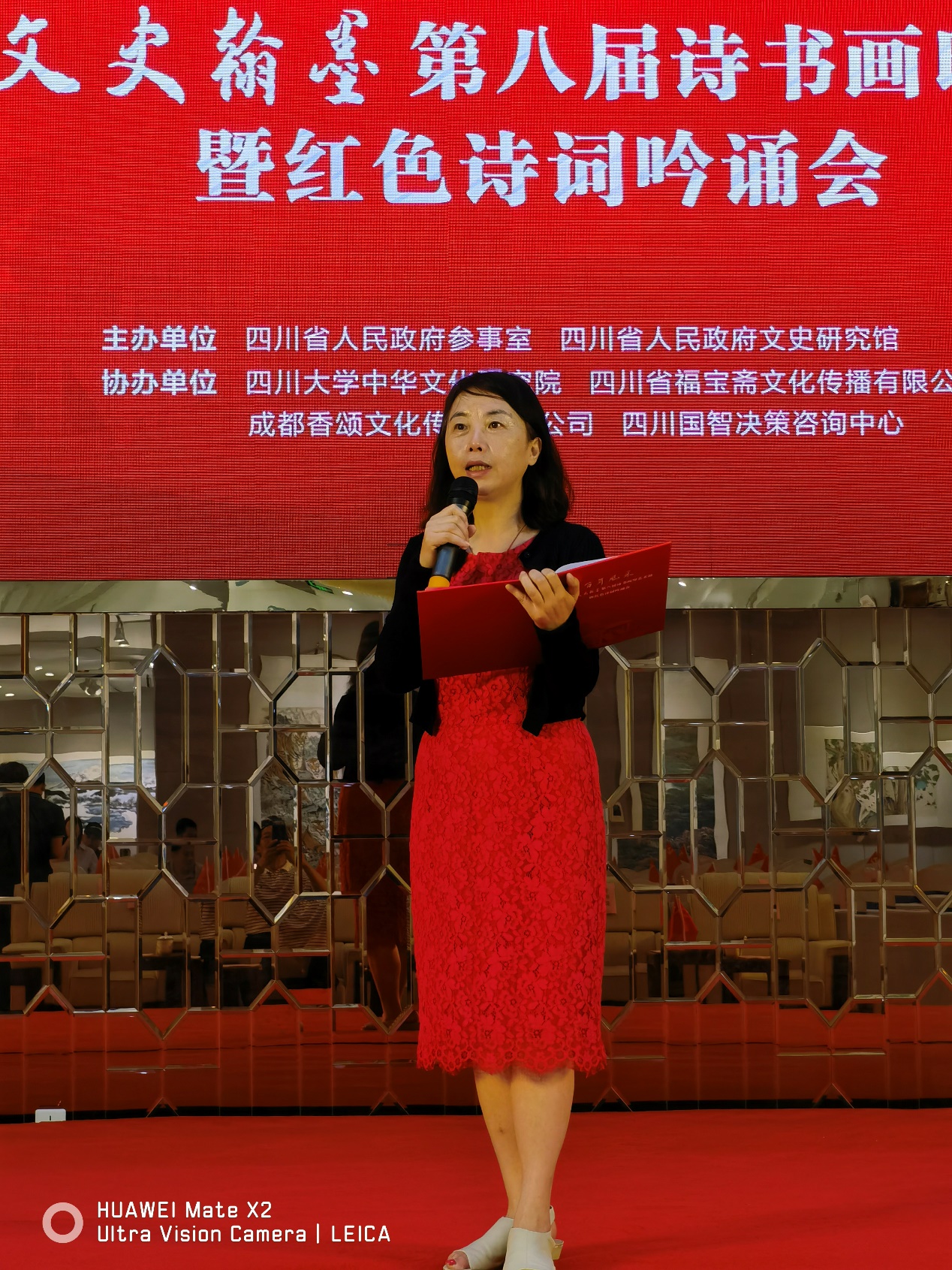 本届艺术展以“百年风采”为主题,共展出110件书法、绘画、篆刻作品。6月19日上午10时,艺术展上还举办了红色诗词吟诵活动,由著名节目主持人寒露主持并分享红色诗词作品,参事、馆员、机关干部等将通过诗词吟诵等方式庆祝党的百年华诞,热情讴歌党领导人民百年来取得的伟大成就。我校唐岚教授作为四川省政府参事参加了活动,并在红色诗词分享中,吟诵了毛主席诗词《卜算子·咏梅》。唐岚老师满怀对党、对人民的深厚感情,用诗词传颂了我们党生生不息的红色精神,表达了对党和祖国的赞美之情。