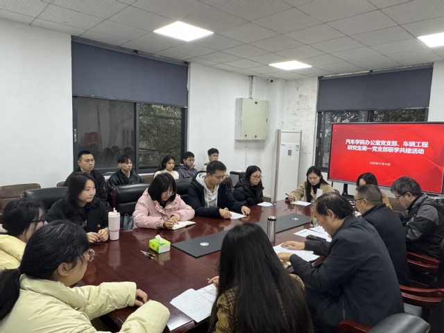为持续提升党支部组织生活质量,深化师生党支部间的交流协作,进一步密切师生联系、凝聚发展合力,2025 年 11 月 14 日,我院办公室党支部与车辆工程研究生第一党支部联合开展主题联学共建活动,两个支部的全体党员齐聚一堂,以学促思、以思践悟,共同筑牢党建根基。
