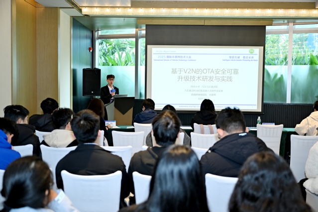 在大会同期举办的“车辆前沿学术”分论坛上,我院阴晓峰教授团队研究生刘莫焊同学以《基于V2N 的OTA安全可靠升级技术研发与实践》为题作学术交流报告,向来自全球的行业专家、学者分享了团队在智能网联汽车OTA升级领域的最新研究成果。报告中,刘莫焊同学详细阐述了团队自主研发的核心技术体系:基于 V2N 通信架构构建车云一体化OTA 系统,打造支持多终端灵活访问的网联汽车OTA云平台,同步完成智能车载终端硬件与软件的自主开发;创新构建“混合加密 + 双向身份认证 + 完整性校验”的三重安全防护屏障,并引入升级回滚机制与断点续传功能,最终形成覆盖“云 - 管 - 端”全链路、兼具高安全性与高可靠性的车辆全生命周期升级解决方案,为解决智能网联汽车OTA升级中的安全隐患与稳定性难题提供了有效技术路径。