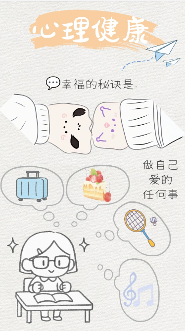 而《心理健康》海报则通过“做自己爱的任何事”这句点睛之笔,结合阅读、音乐、美食、旅行等生活化场景,生动诠释了幸福源于内心热爱与自我关怀的朴素哲理。