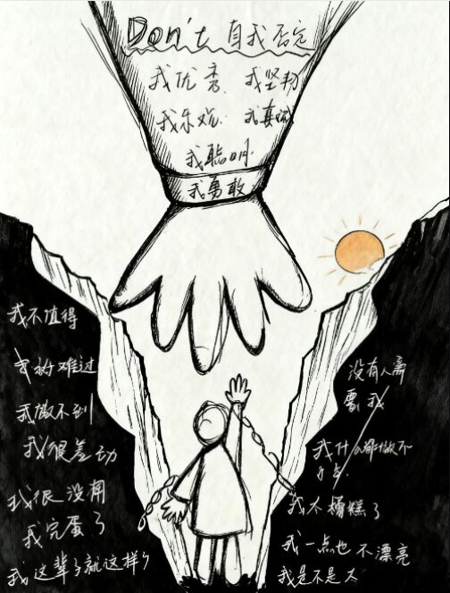 在关于自我认知的主题上,一幅对比强烈的黑白手绘漫画《Don't自我否定》给人以深刻冲击。画面中央,一只写满“我优秀、我坚韧、我勇敢”等积极品质的大手,与下方被“我不值得”、“我做不到”等消极铁链束缚的小人形成鲜明对比,直观展现了内心积极力量与自我否定之间的拉扯,呼唤着对自身价值的确认与肯定。