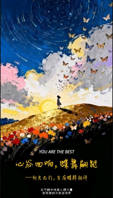 一幅题为《心谷回响,蝶舞翩跹》的作品,以宏大的星空与开满鲜花的山坡为背景,描绘了一个背对观者的身影与群蝶共舞的画面。海报上“向光而行,自有蝶群相伴”的寄语,诗意地诠释了“在宁静中培育心理力量,实践自我接纳与自信培养”的核心主题,鼓励个体在浩瀚世界中寻找自身定位与内在光芒。