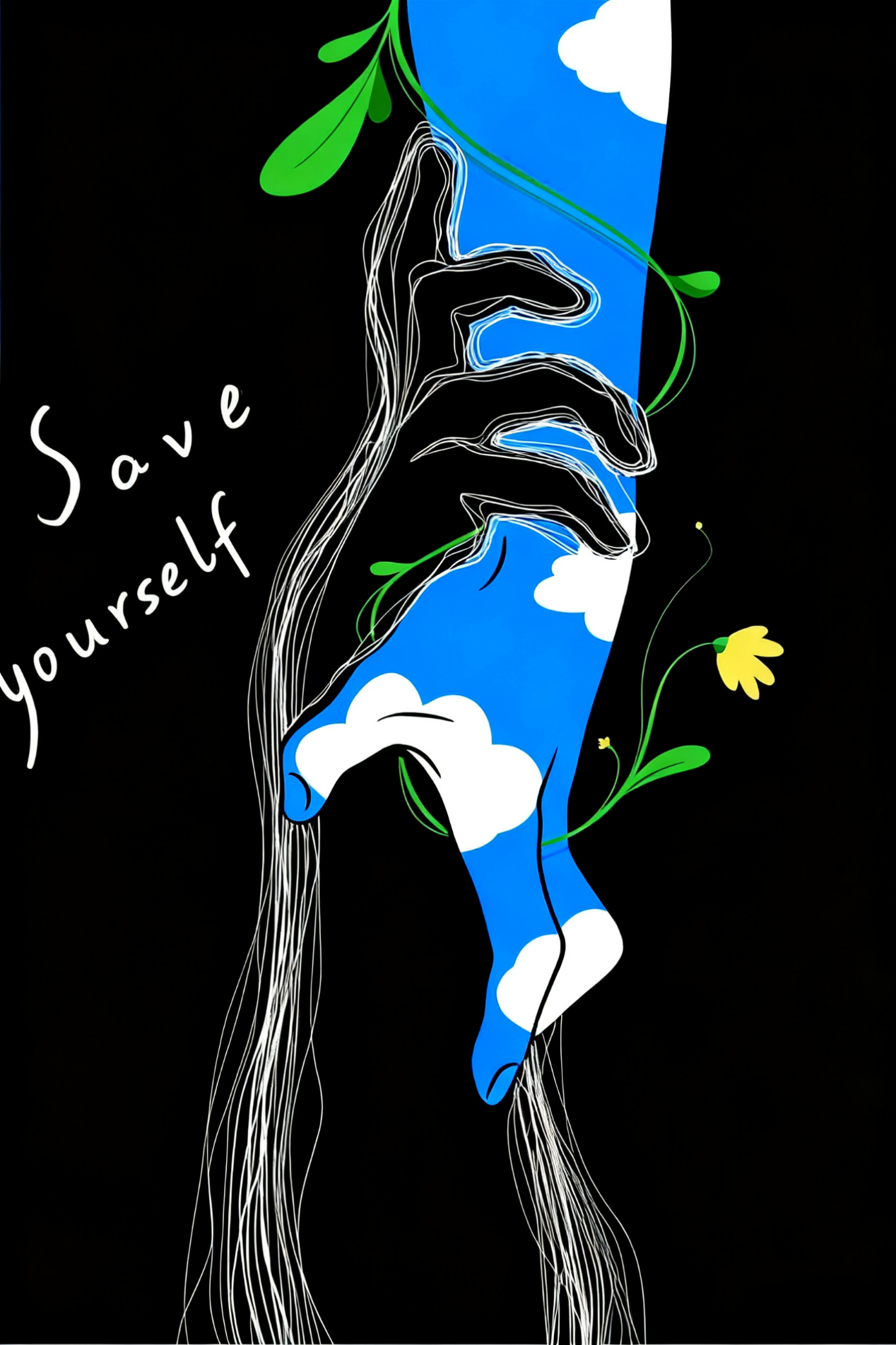 此外,《Save yourself》以极简的线条与强烈的色彩对比,勾勒出一只握住希望的手,强调了自我救赎的内在力量;