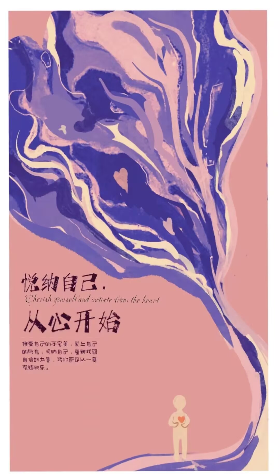 《悦纳自己,从心开始》则以温暖色调和拥抱爱心的形象,传达出接纳自我是美好起点的理念;