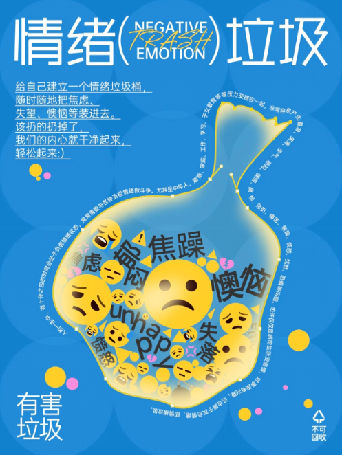 直面情绪管理的《情绪“垃圾”处理指南》海报,则以创意概念引人深思。作品将“焦虑”、“烦躁”等负面情绪具象化为可被分类处理的“垃圾”,倡导同学们建立属于自己的“情绪垃圾桶”,学会及时清理内心负荷,从而“让内心干净起来,轻松起来”,以幽默而直接的方式传递了压力管理的积极态度。