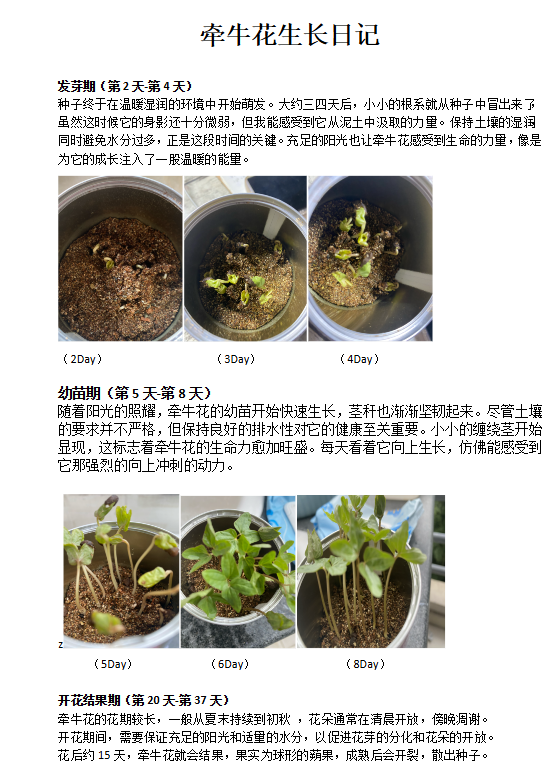 活动中,同学们既是园丁,也是记录者与思考者。大家悉心照料各自领取的绿植,用照片和文字记录其生长点滴,也同步书写自己的心情变化与成长感悟。有同学在日记中分享:“每天定时照顾这盆绿萝,让我学会了在快节奏中停下来、专注当下,这是一种重要的生存技能。”还有同学表示,看着牵牛花在自己的呵护下焕发生机,增强了自己应对困难、热爱生活的信心。这些体验与思考,正是“三生教育”从理念认知转化为同学们情感认同与行为习惯的生动体现。