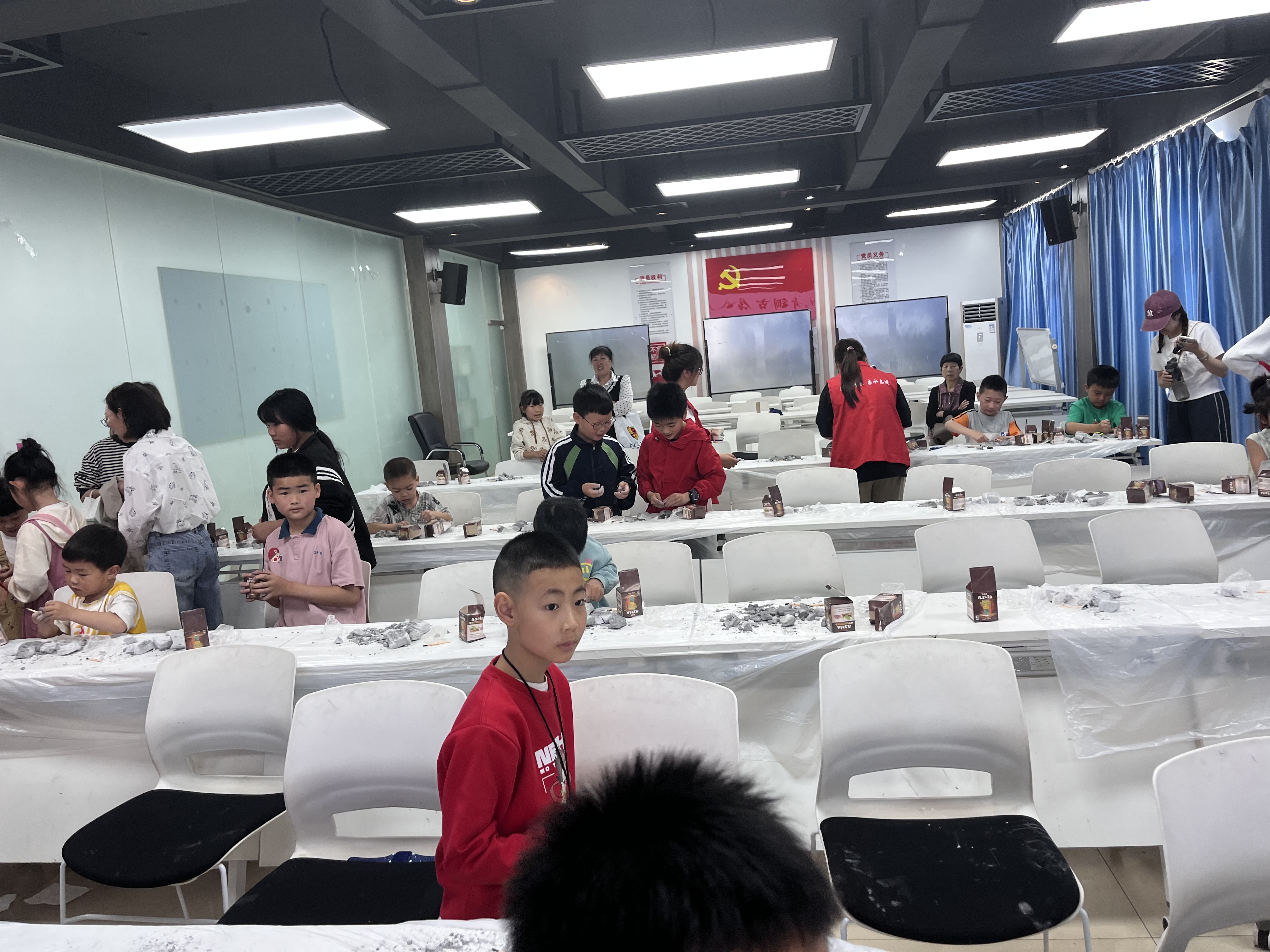 活动现场,实践团成员精心设计了“考古盲盒挖掘”“青铜器纹饰拓印”“三星堆知识竞答”三大实践环节。在“考古盲盒”体验区,孩子们手持迷你考古工具,化身“小小考古学家”,从土块中挖掘出仿制青铜面具、玉璋等微型文物模型。这些模型均参照三星堆出土文物1:50复刻,孩子们在清理土层、拼接碎片的过程中,直观感受考古工作的严谨与乐趣。“我挖到了一个青铜面具,它的眼睛像望远镜一样凸出来!”李*然兴奋地展示着自己的“考古成果”。