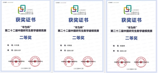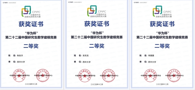 2025年11月24日,由教育部学位管理与研究生教育司指导,中国学位与研究生教育学会、中国科协青少年科技中心联合主办的“华为杯”第二十二届中国研究生数学建模竞赛获奖名单正式揭晓。我院罗建老师指导的两支参赛队伍不负众望,双双荣获全国二等奖,其中焦胜洋、吴奕龙、常露露团队征战D题赛道,叶洪清、何明奕、杨登辉团队冲击E题赛道,实现学院在该国家级顶尖赛事中的重大突破,充分彰显了学院研究生培养在创新实践与跨学科应用领域的扎实成效。