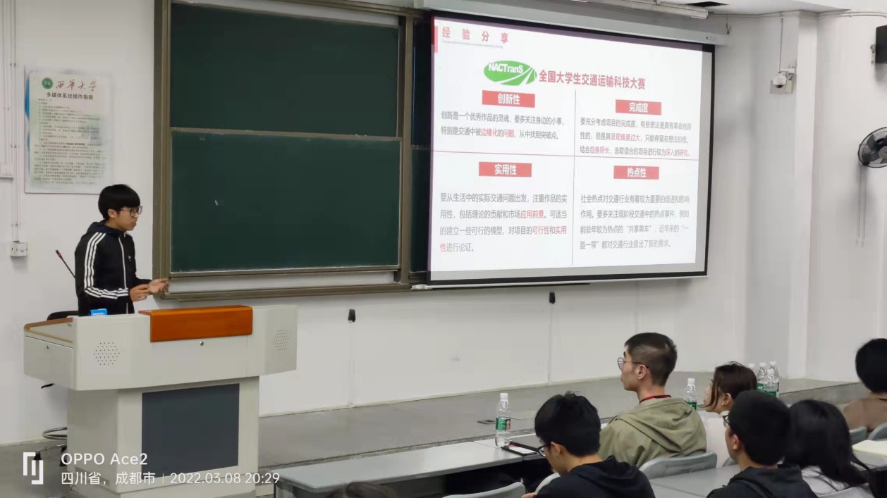 第三部分何迪老师介绍了今年交通科技大赛的比赛流程以及今年决赛地点:上海海事大学,讲述了这次宣传活动于3月开展的原因和校内选拔的相关事宜,这是所有学生最希望了解的内容,讲解清晰细致。