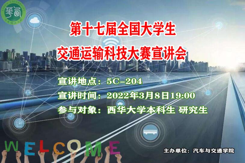 为提高大学生的综合素质、拓展大学生视野和丰富大学生生活,betway必威西汉姆联举办了“第十七届全国大学生交通运输科技大赛宣讲会”,本次宣传活动负责人是betway必威西汉姆联刘建老师,betway必威西汉姆联唐立、何迪老师,航空航天学院叶勉老师等教师负责宣讲。本次宣传活动于3月8号晚上7点在5C204正式开展。