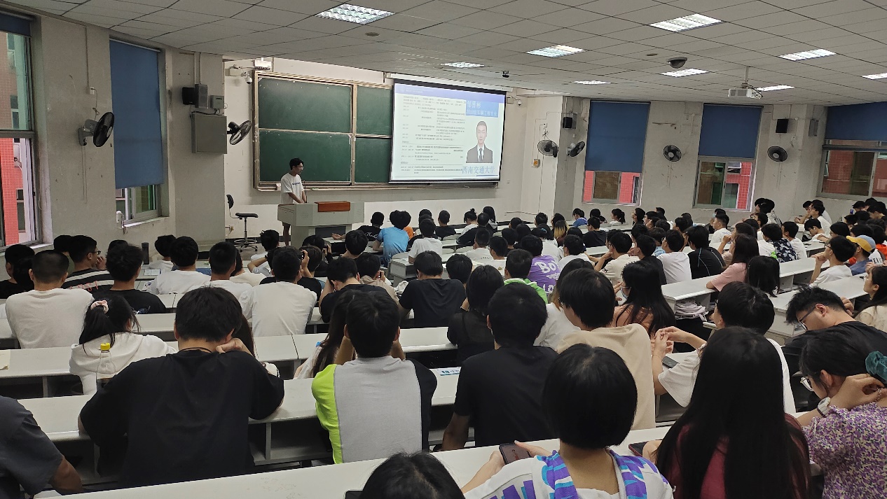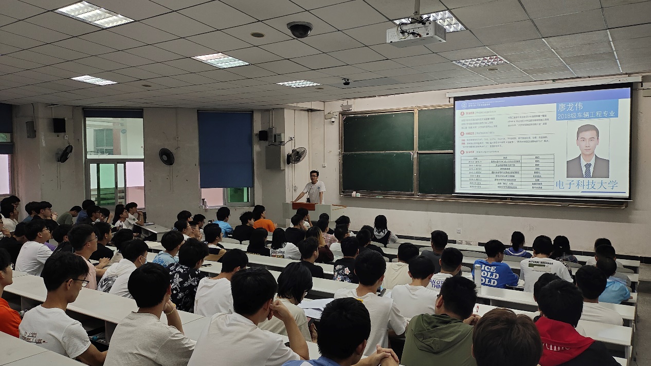 2018级车辆工程专业学生廖龙伟讲述了自身成功保研电子科大的经历,向与会同学讲解了保研的流程与规则。随后他对自己大学生涯做了简单梳理,强调参加学科竞赛和通过四六级考试的重要性。另外,他告诫在场同学要合理规划时间,在保证学习的基础上多参加各类活动,不要浑浑噩噩、虚度光阴。最后,他讲解了高校暑期夏令营的组织形式与考察内容,鼓励同学们勇于尝试、不懈拼搏。