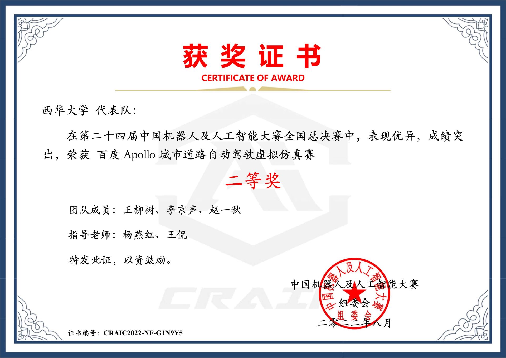 2022年8月19日,由中国人工智能学会、慈溪市人民政府共同主办的第二十四届机器人及人工智能大赛全国总决赛落下帷幕,由我校betway必威西汉姆联杨燕红、王侃老师指导,betway必威西汉姆联王柳树、李京声和电气与电子信息学院赵一秋三名同学组成的西华大学“WZ先锋队”获得自动驾驶虚拟仿真赛项的全国二等奖,为学校争得荣誉。
