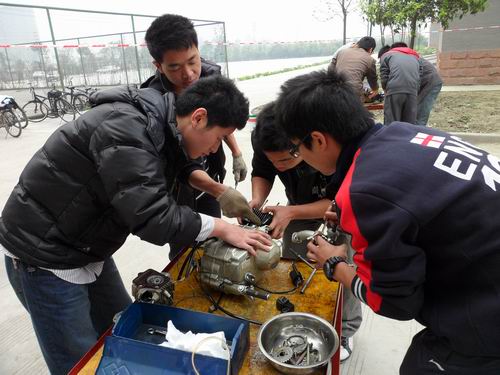 两个小时后,选手按抽签决定的序号依次进入赛场。经过了专业的培训,他们个个都摩拳擦掌,迫不及待地想自己动手实践。随着总裁判一声令下,参赛选手们展开了激烈的角逐,各队队员分工合作,将自己的理论知识融入实际操作中,充分利用刚学到的拆装技巧,通过相互巧妙的配合,以最快的速度向发动机“进攻”。就连平时娇弱的女生此时在笨重的发动机前也显示出别样的风姿。因为绝大多数选手是第一次拆装发动机,所以比赛过程并非一帆风顺,但团队的力量使得大家拧成一股绳,最终顺利的完成了比赛任务。