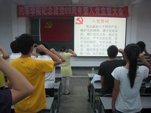 为庆祝中国共产党成立89周年,坚定学院党员共产主义信念,加强对党员的培养和教育,630日下午,汽车学院分党委在6B-107隆重举行纪念中国共产党建党89周年暨入党宣誓大会。学院分党委委员、各支部书记和全体学生党员和部分教师党员参加了纪念和宣誓大会。大会由学院分党委副书记毕达平主持。