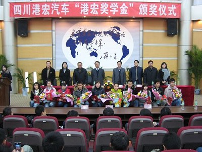 12月25日下午,四川港宏企业管理有限公司为奖励交通与汽车工程学院自强奋斗的优秀学生的“港宏奖学金”颁奖典礼在四教报告厅隆重举行。港宏集团副总裁安藤永一、经营企划部经理徐晓东、港宏别克总经理谭红岗、港宏新通总经理邓建军、港宏新通维修站站长朱江等一行九人出席了典礼。校党委副书记曾德祥、学工部部长王政书、汽车学院院长黄海波、学院党总支书记魏远文等领导以及汽车学院部分优秀学生参加此次典礼。