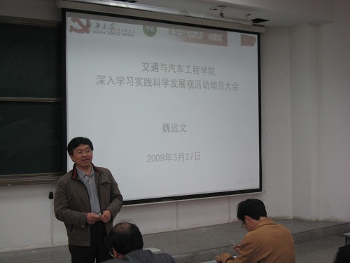 | 3月27日下午1:00,交通与汽车工程学院在5C-204多媒体教室举行深入学习实践科学发展观活动动员大会,全院教职工党员和学生党员参加了此次大会,会议由学院党总支副书记副院长毕达平主持。 会上,学院党总支书魏远文围绕科学发展观的深刻内涵以及深入学习实践科学发展观活动的意义作了重要讲话。魏远文在讲话中谈到,学习科学发展观对于学院全体党员用这一重大战略思想武装头脑具有特殊的重要意义,因此要求全院师生党员高举中国特色的社会主义伟大旗帜、明确发展思路、解决突出问题、结合我院特色、创新机制体制,实现我院又好又快的发展。 院长黄海波在动员大会上介绍了我院深入学习实践科学发展观活动的组织机构,对我院的第一阶段工作作了具体的部署。同时他强调,我们开展各项工作要坚持以人为本为中心,全面协调发展。 动员会后,学院立即召开了党支部书记工作会议,就现阶段的具体工作作了详细的安排部署。   |