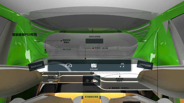 上图为该智能座舱的中控屏,该台面本身为一个可承重防水触摸屏,平时不用的时候可以下放到车的地板上,要用的时候可以升上来进行使用。作为全车的主控中心,可以在任何时候对全车功能和内外信息进行控制和管理。该屏可以一个人使用,也可以进行多人分屏互动,分屏后各不干扰,可以实现用户的电子娱乐需求和办公学习需求,满足用户的独处或结伴时候的消遣娱乐。