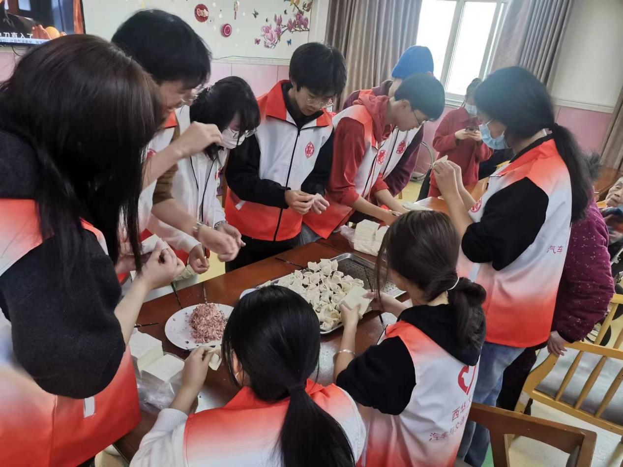 中午十二点半,在青服队的组织带领下,全体志愿者前往成都市郫都区虹满天康养中心。到达目的地后,志愿者穿戴好工作服装,佩戴好工作证开始进行一系列志愿服务活动。待养老人们睡醒午觉后,志愿者们开始为每位老人送上我院精心准备的小礼物,和老人们一起包抄手。在开展志愿服务过程中,志愿者们热心、温暖、周到的服务让老人们联想起自己的孙子孙女。在整个活动进行中,志愿者与老人们的欢声笑语此起彼伏,让以往清静养老院也变得热闹了起来。