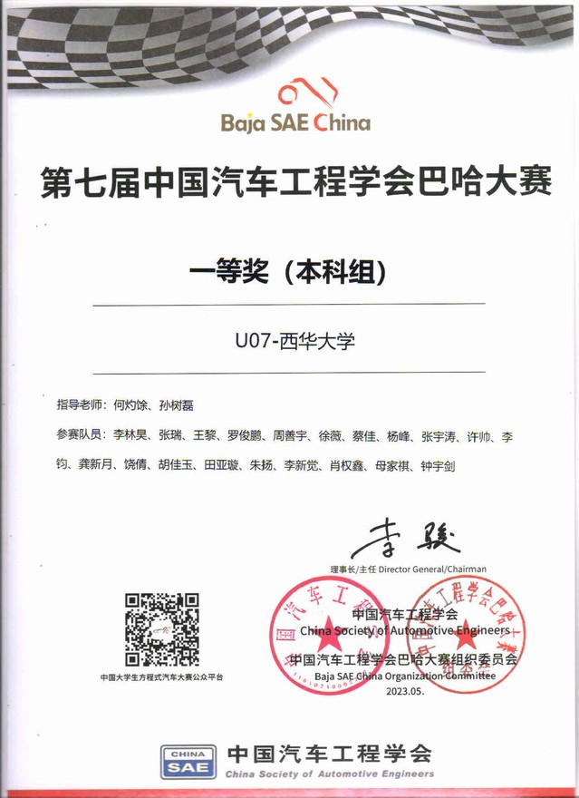 2023年5月24日-28日,第七届中国大学生方程式系列赛事巴哈大赛(襄阳站)在襄阳举行。来自国内56支车队的近1200名大学生,在各项紧张的赛事中顽强拼搏,角逐年度总冠军。西华大学巴哈车队在比赛中脱颖而出,获得操控赛第一名,耐久赛第三名,单圈计时赛第三名,年度总亚军,总成绩一等奖。