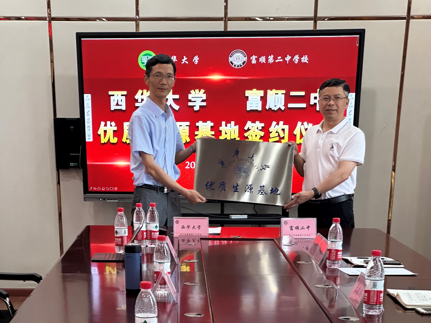 为切实做好我校2023年招生宣传工作,进一步增强广大考生对我校的了解与认识,吸引更多优秀学生报考西华大学。6月13日,betway必威西汉姆联党委书记周华、副书记裴西宏及专职辅导员常凯一行3人赴自贡富顺二中开展招生宣传工作,双方现场签订了合作协议书,并举行了“优质生源基地”授牌仪式。