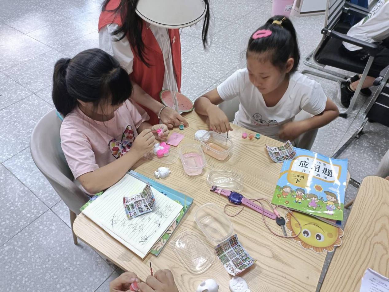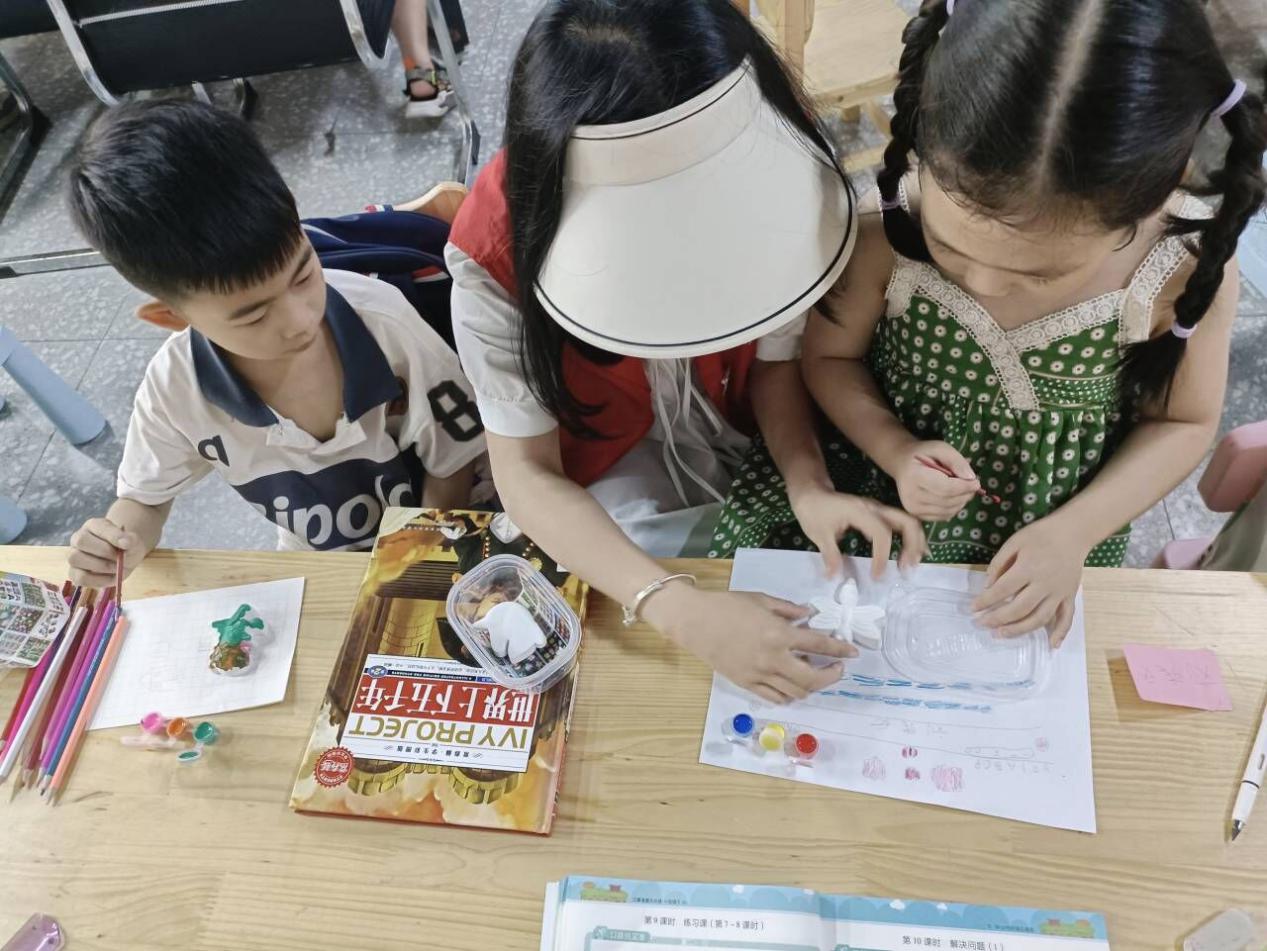 除了帮小朋友们辅导课业以外,实践团成员还带领他们进行素描绘画、读绘本、石膏娃娃彩绘等活动。实践团成员积极响应“双减”政策,本着“让教育回归本源,减轻中小学课业负担,使学生受到有质量的教育”的初心,不断丰富“假期小课堂”活动的内容,不仅辅导了孩子们书本上的功课,还通过读绘本、作彩画、涂石塑等活动对其开展了美育,进一步丰富了孩子们的课余生活,点亮了他们认识美、发现美、创造美、热爱美的心灵。