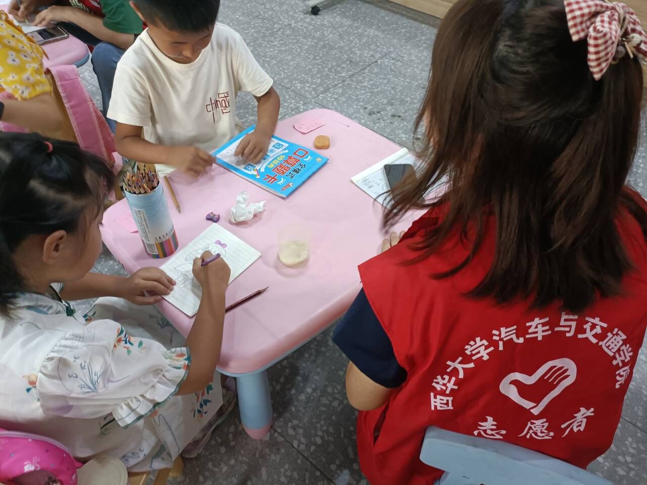 实践团成员教小朋友为素描作品上色  宋磊 供图