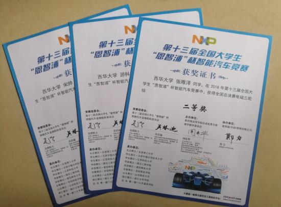 “恩智浦”杯智能汽车竞赛(全国总决赛)获奖证书