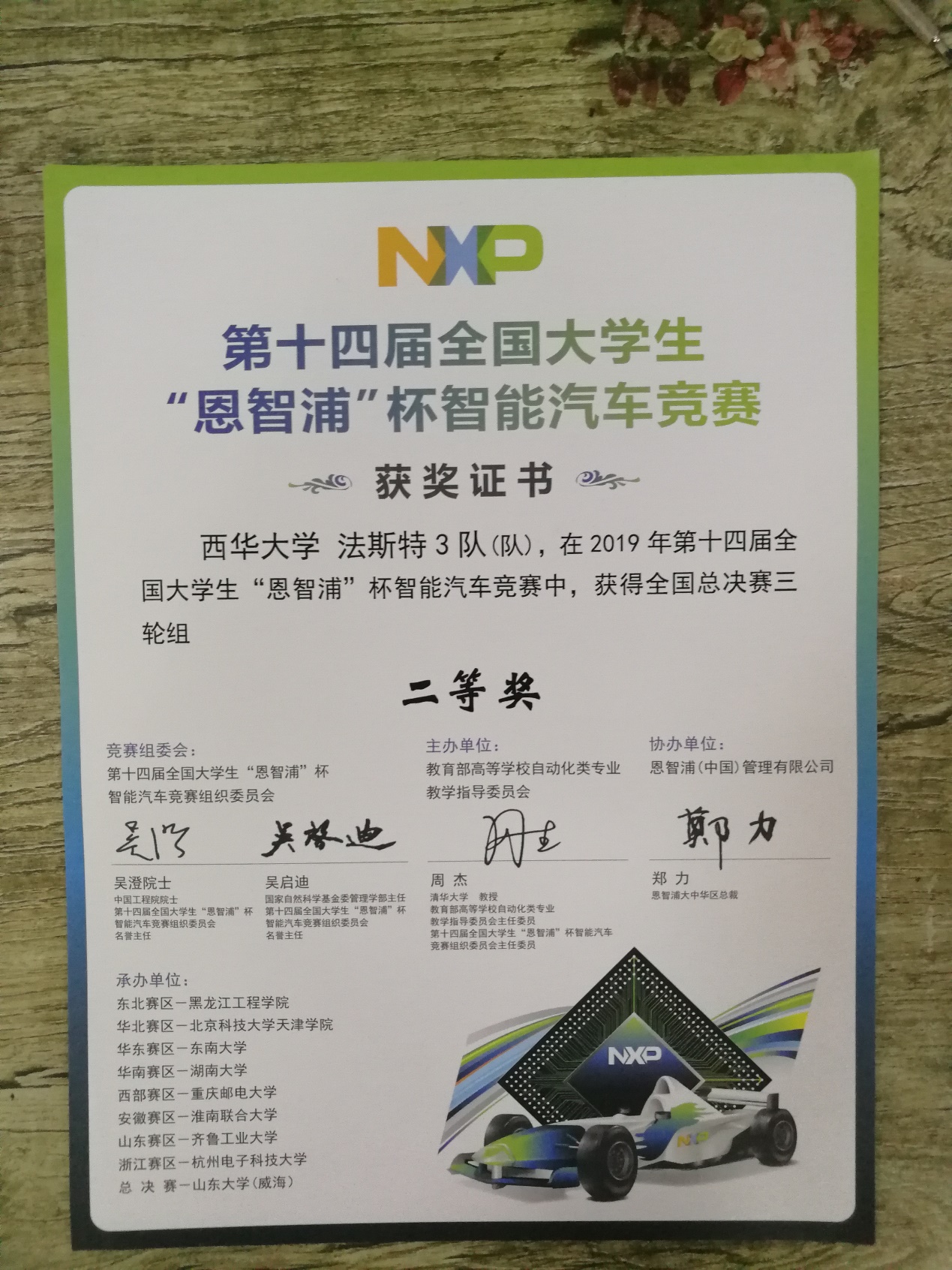 8月22日-25日,由教育部高等学校自动化类专业教学指导委员会主办,恩智浦半导体公司协办的第十四届全国大学生“恩智浦”杯智能汽车竞赛全国总决赛在山东大学(威海校区)举行,我校代表队betway必威西汉姆联飞思卡尔车队法斯特3队(队员:董康、杨浩楠、罗诚)在彭忆强、陈飞老师指导下,获变形金刚三轮组全国二等奖。
