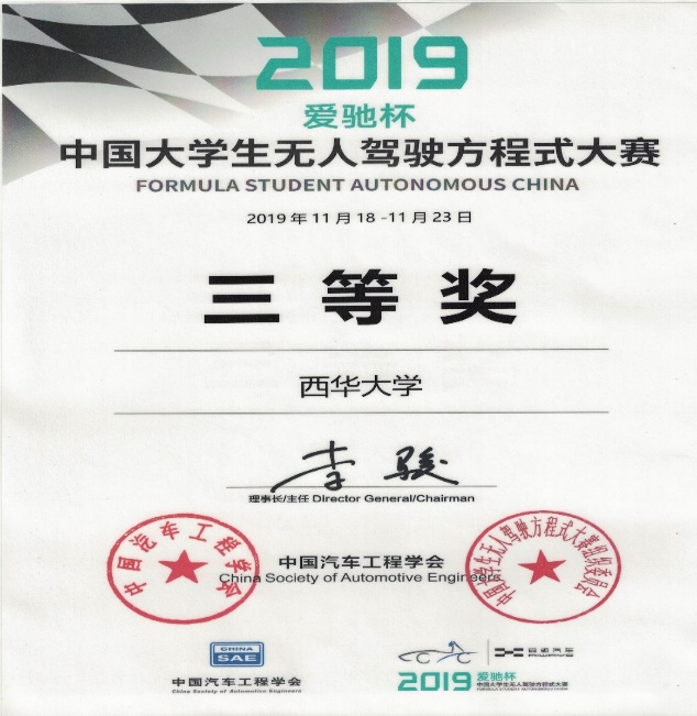 11月18日—23日,2019中国大学生方程式系列赛事(珠海站)暨蔚来杯中国大学生电动方程式大赛(FSEC)、爱驰杯中国大学生无人驾驶方程式大赛(FSAC)在珠海航展中心举行。来自国内外54支纯电动车队和14支无人驾驶车队的近2000名大学生,在各项紧张的赛事中顽强拼搏,角逐年度总冠军。经过激烈角逐,最终,西华大学FSAC大学生无人驾驶方程式车队和西华大学E-Panda纯电动车队均获得全国三等奖。